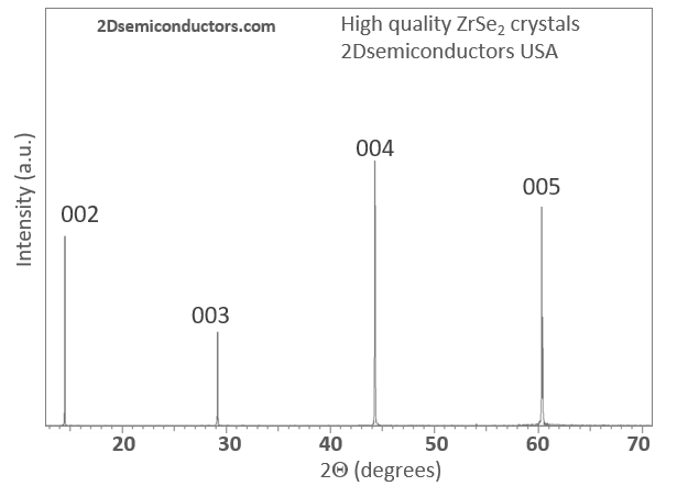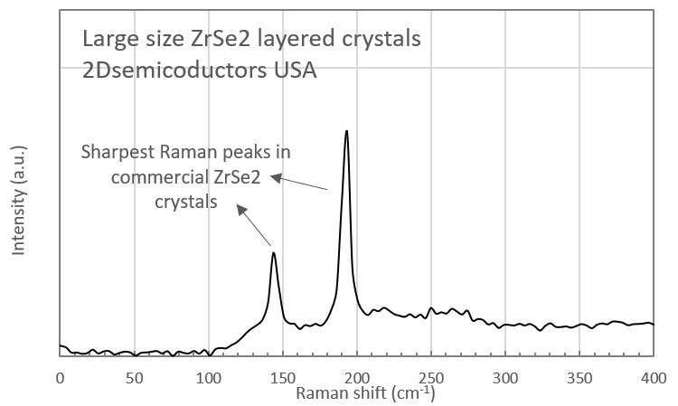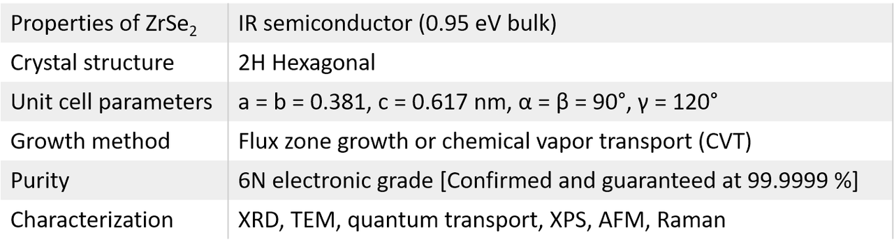 ZrSe2 belongs to group-IV TMDCs family and adopts a stable 2H-hexagonal structure. ZrSe2 is 0.95 eV indirect gap semiconductor in the bulk form. These ZrSe2 crystals were designed and optimized at our facilities starting 2013 to achieve perfect electronic grade materials with: 1) excellent stoichiometry, 2) large single domain size, 3) single phase materials without any mixed phases or amorphous content, 4) unmatched purity -electronic grade (6N), 99.9999% confirmed purity. Our crystals exhibit sharpest Raman and XRD peaks in the commercial market proving the high quality of our materials.