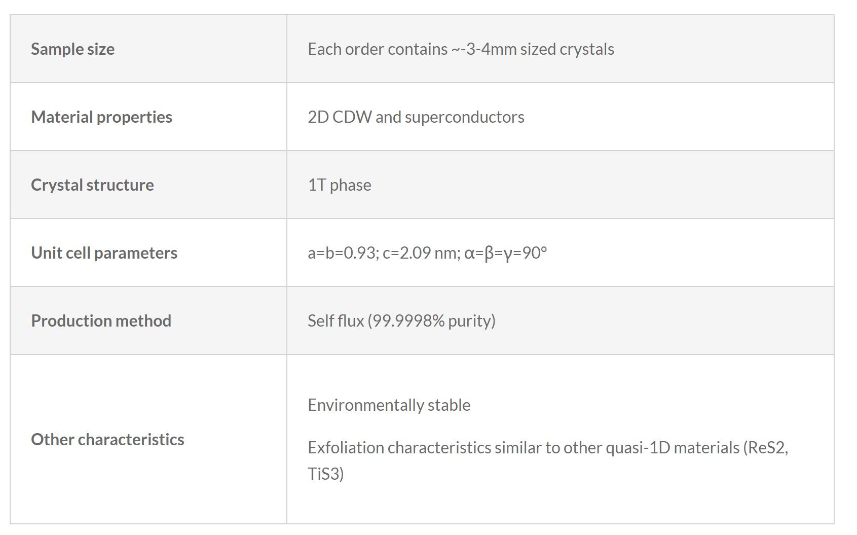 NbTe4 crystal is a quasi-1D CDW material belonging to space group P4/mcc. In these materials, the metal cation atoms quasi-linear chains along the anisotropy axis. NbTe4 undergoes a strong lattice reconstruction near room temperature to form an incommensurate charge density wave (CDW) phase and further exhibits pressure induced superconductivity. Our NbTe4 crystals were synthesized using self flux technique at 99.9998% purity levels with excellent electronic properties. Each order contains a single crystal measuring <5mm in size.