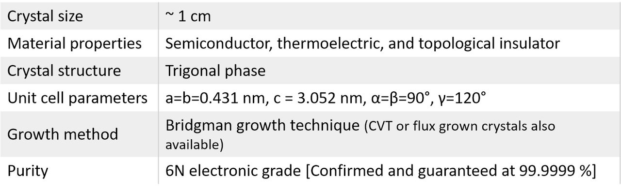 Bismuth Telluride (Bi₂Te₃) Developed at our facilities since early 2013 to optimize the perfect stoichiometry and stabilize the topological insulator state.Topological insulator is a new class of material, in which its bulk is insulating while its surface states are conducting. The surface states of topological insulator are robust against any external perturbation because such states are protected by time-reversal symmetry. Similar to transition metal dichalgonides and graphite, Bi₂Te₃ is also layered material with weak interlayer coupling. Our crystals are develop in our laboratories in last two years and are highly crystalline. Raman spectrum displays very sharp and clear modes at 102 cm-1 and 134cm-1 with FWHM less than 4cm-1. If your research needs doping in Bi2Te3, we can also incorporate Ca, Nb, Ni, and Au dopants in Bi2Te3 crystals. Please also see our Tl alloyed Bi2Te3 crystals to advance your topological insulator studies.