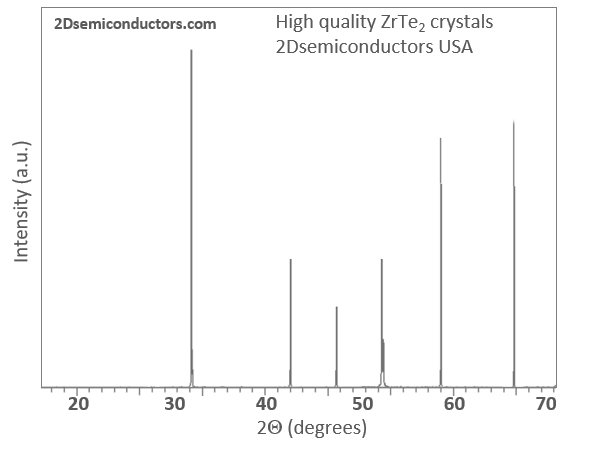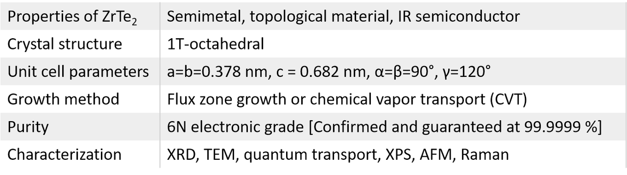 ZrTe2 belongs to group-IV TMDCs family and adopts a stable 1T-octahedral structure. ZrTe2's eelectronic bandstructure has interesting characteristics showing crossings of valence and conduction bands, near the Fermi level suggesting topological 3D Dirac semimetal behavior [1]. Interestingly, DFT calculations have also shown opening of electronic band gap for sheets below 3-4 layers, and becomes direct gap semiconductor in monolayer form (Egap~0.3-0.5 eV). These ZrTe2 crystals were designed and optimized at our facilities starting 2014 to achieve perfect electronic grade materials with: 1) excellent stoichiometry, 2) large single domain size, 3) single phase materials without any mixed phases or amorphous content, 4) unmatched purity -electronic grade (5.8N), 99.9998% confirmed. Our crystals exhibit sharpest Raman and XRD peaks in the commercial market proving the high quality of our materials.purity.