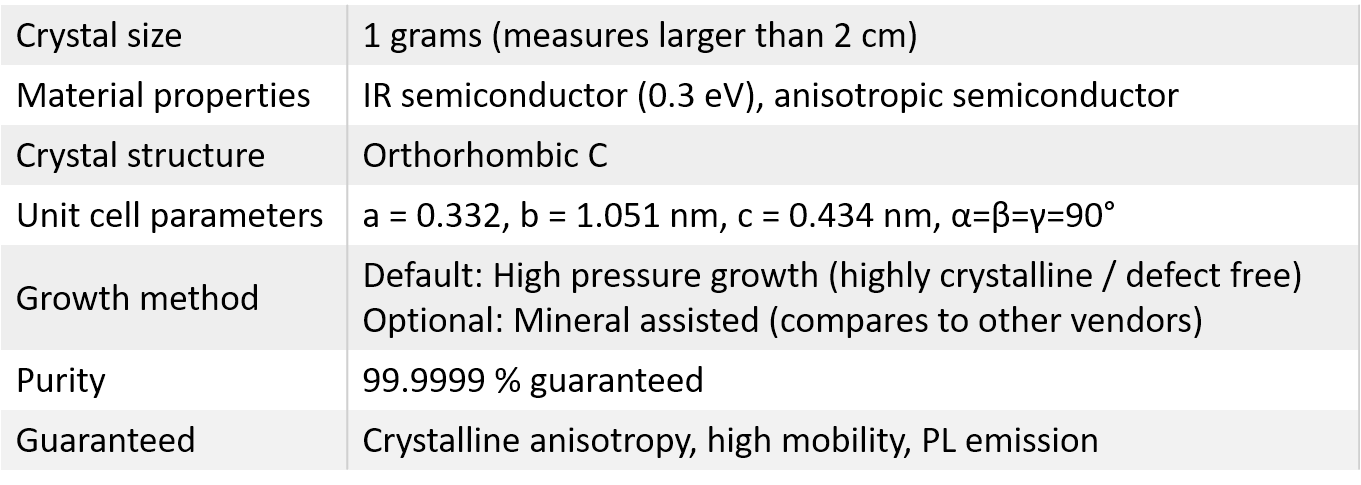 Growth technique matters: Conventional BPs growth typically involves chemical assisting agents such as Au, Sn, SnI4, and others to synthesize BPs crystals at low temperatures and low pressures. This process creates highly defected, low electronic mobility, and crystalline anisotropy crystals. Our company is dedicated to bringing electronic, optical, and scientific grade crystals. We synthesize our crystals at pressures as high as 2GPa to stabilize black phosphorus crystals without using any chemical assists (transport agents). Crystallization occurs over two (2) months period to ensure growth is slow enough to create defect free crystals. Yet, we still bring large quantities of BPs crystals at affordable rates. Note one order may contain more than one single crystal.
