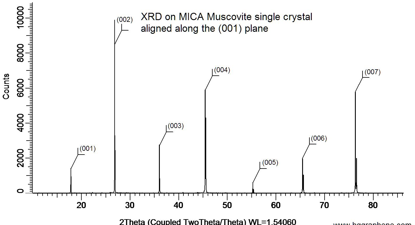 X-ray diffraction on a MICA Muscovite single crystal aligned along the (001) plane. XRD was performed at room temperature using a D8 Venture Bruker.