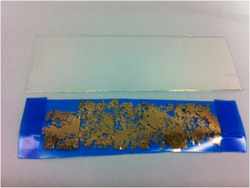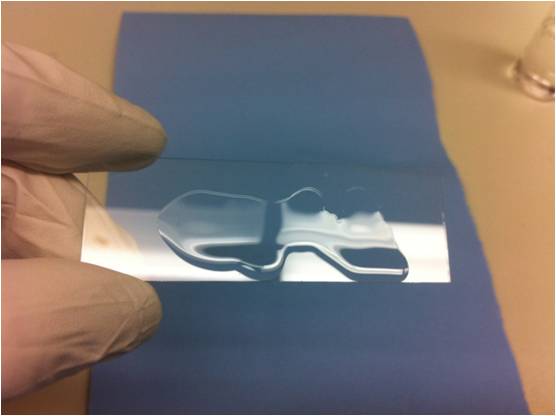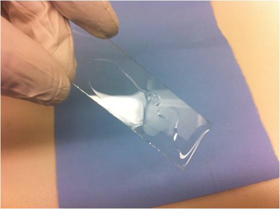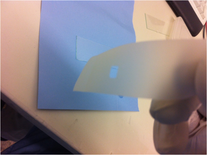 轻轻地从聚合物上取下胶带,由于蓝色胶带没有牢固地粘在聚合物上,所以它不会将聚合物从玻璃板上移除。